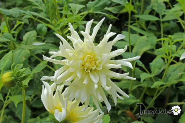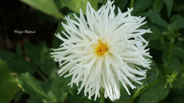 Dahlia 'Playa Blanca' is een cactusdahlia (spinnekopdahlia) met goed gevulde witte bloemen. De bloemblaadjes zijn bijna volledig opgerold.