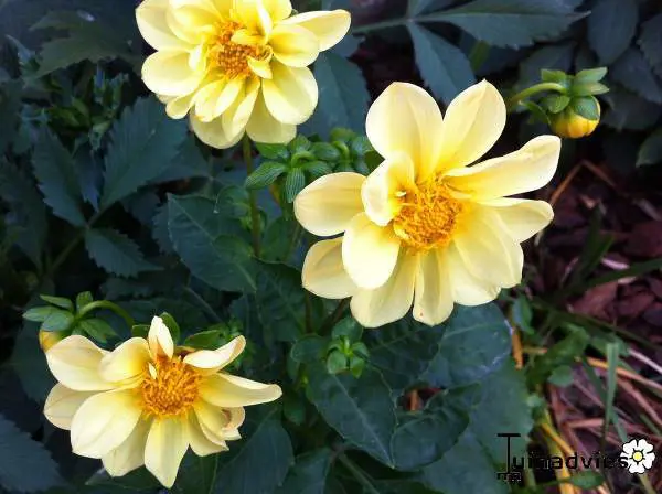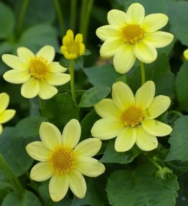 Dahlia 'Sanne' is een mignondahlia met een rij brede helgele lintbloemen rond een open hart.