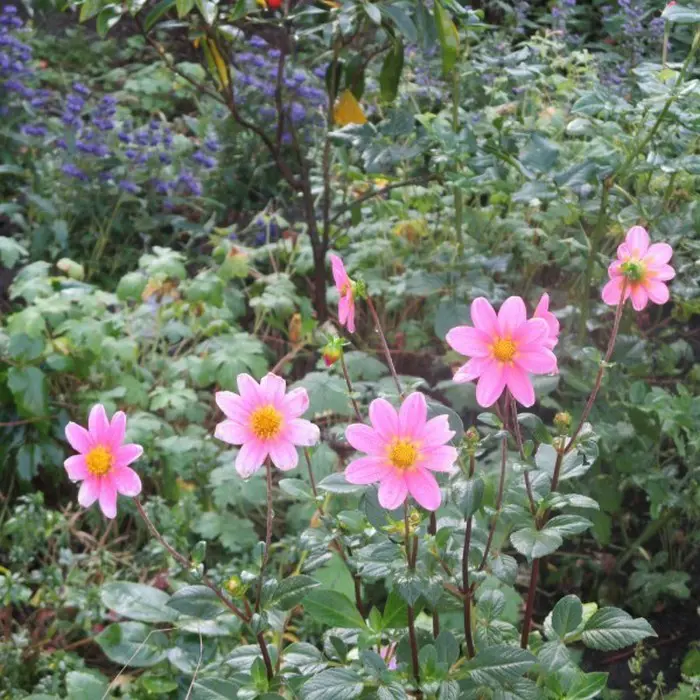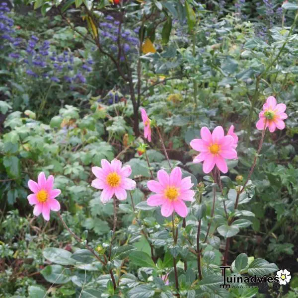 Dahlia 'Topmix Pink' is een topmix dahlia, is zeer compact en bloeirijk met kleine roze bloemen met een geel hart.
