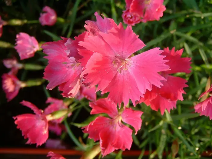 Dianthus 'Kahori' vormt een klein compact kussen met grasachtige blauwgroene bladeren.