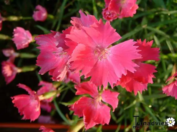 Bloeit zeer rijkelijk aan fijne stengels met kleine, geurige, helder karmijnroze bloemen, iets lichter in het hart.