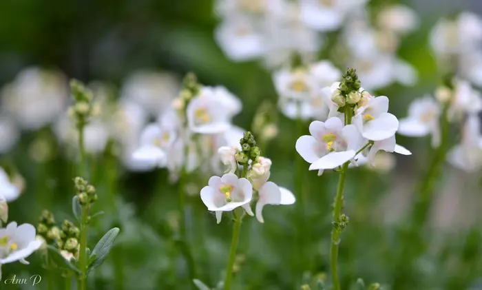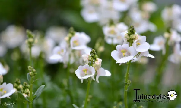 Diascia vigilis 'White' is een krachtige, matvormende vaste plant met vlezige, eivormige tot lancetvormige, getande, lichtgroene bladeren.