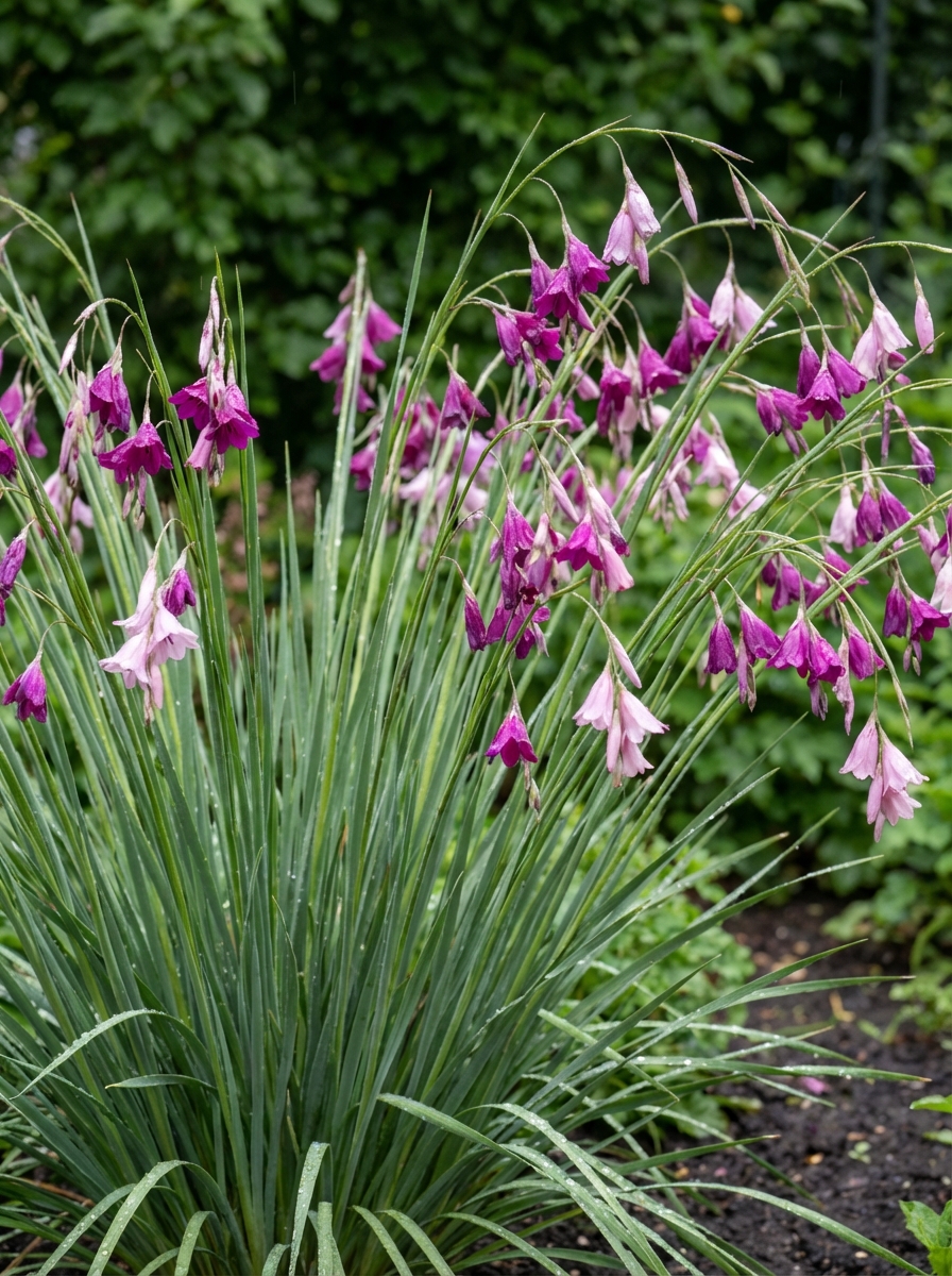 Dierama pulcherrimum afkomstig uit Zuid-Afrika, heeft een grasachtig blad met een lange gebogen stengel waar de rozerode klokjesbloemen aan hangen die trillen bij het minste briesje.
