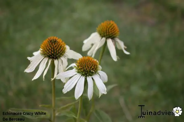 Echinacea purpurea 'Crazy White' is een verbeterde variëteit met helderwitte afhangende bloemblaadjes rond een grote oranje kegel.