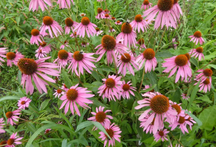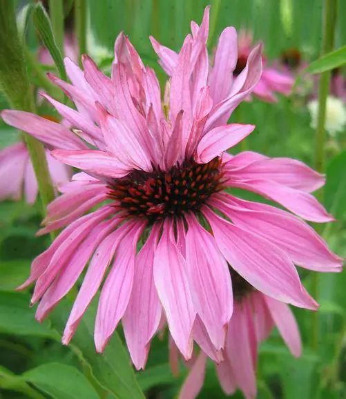 Echinacea purpurea 'Doubledecker' onderscheidt zich door zijn bloemhoofdjes die tijdens het tweede bloeijaar een tweede bloem krijgt bovenop de centrale kegel. De bloemblaadjes zijn magentarood rond een oranjebruine kegel.