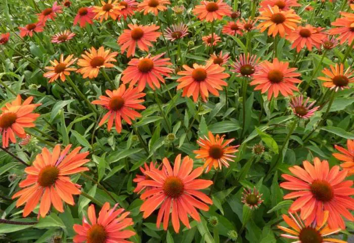 Echinacea purpurea 'Summer Fire' bloeit van oranje naar rood.
