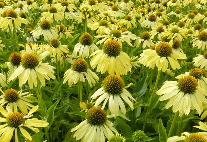 Echinacea 'Sunrise' bloeit met zachtgele bloemen op stevige stengels.