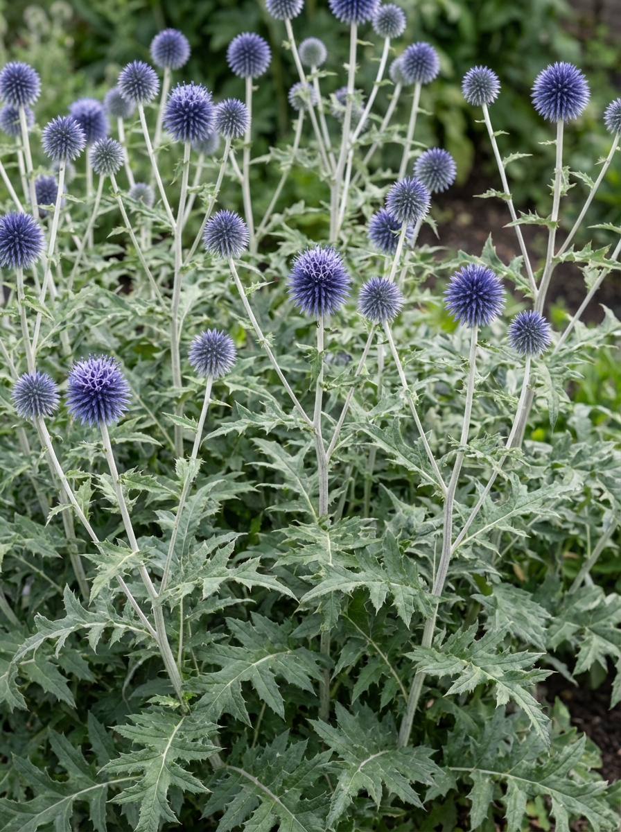 Bloeit met kleine stekelige pompons van een intens en metaalachtig azuurblauw.