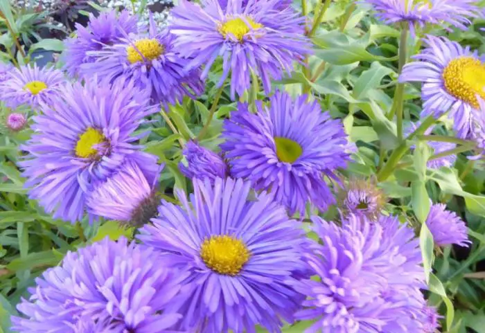Erigeron 'Azure Beauty' hebben lavendelblauwe fijne straalblaadjes rondom een geel oog.