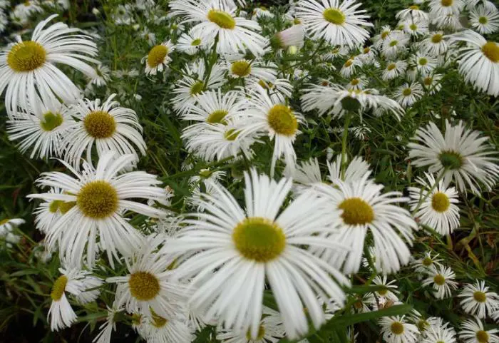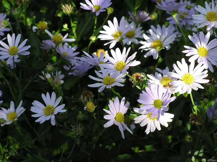 Erigeron 'Sommerneuschnee' heeft fijne witte straalblaadjes rondom een geel oog. Later verkleuren de bloemblaadjes roze.