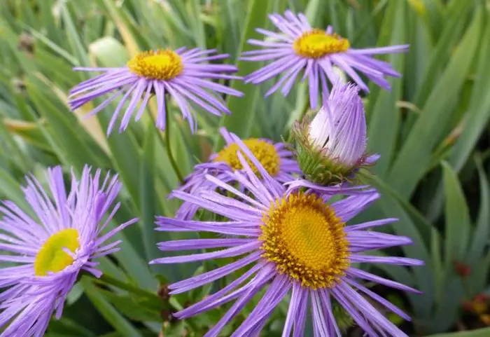 Erigeron 'Strahlenmeer' heeft halfdubbele bloemen met fijne lavendelblauwe straalblaadjes rondom een geel oog.