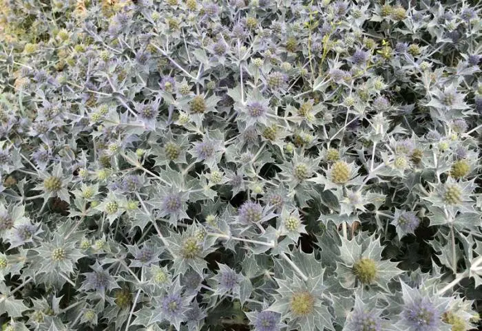 Bloeit met ronde metaalblauwe distelachtige bloemhoofdjes omgeven met een stekelige zilverwitte kraag.