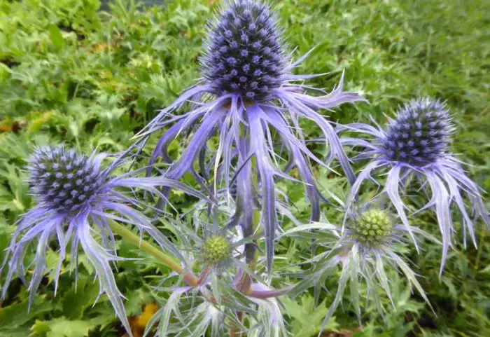 De distelachtige bloem bestaat uit een stekelig violetblauw schutblad rond een kegelvormige violetblauwe schermbloem op donker paarsblauwe stengels.