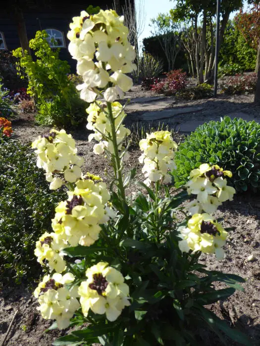 Erysimum linifolium 'Dark Yellow GLOW' bloeit met donkergele bloemen.