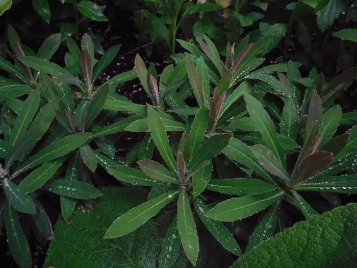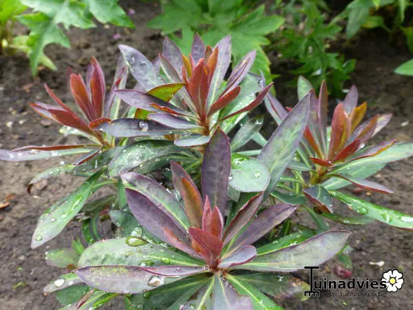 Lancetvormige bladeren lopen helder roodpaars uit en worden daarna geleidelijk bronsgroen.