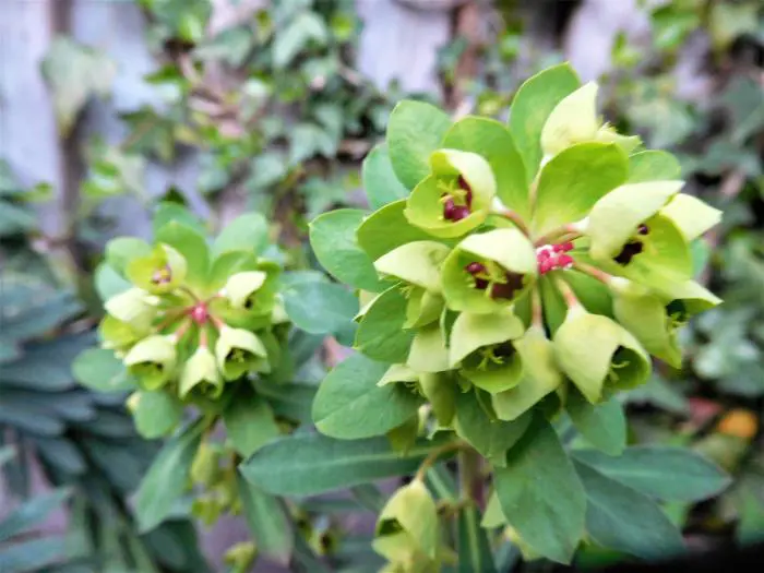 Bloeit in het voorjaar op dikke rode stengels met dikke trossen van rode bloemknoppen die geelgroen openbloeien.