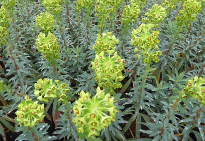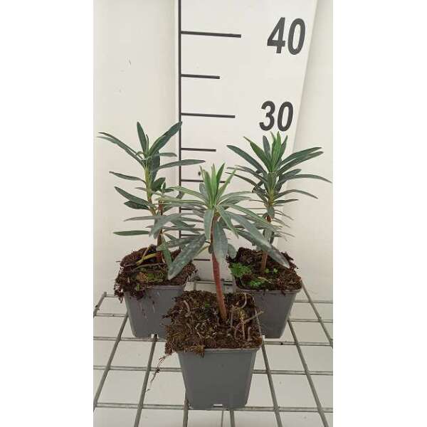 Euphorbia characias 'Blue Wonder' is een compacte, bossige wintergroene vaste plant met aantrekkelijke, zilverblauwe lineaire bladeren.