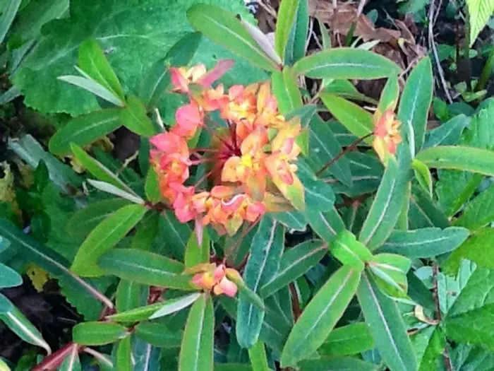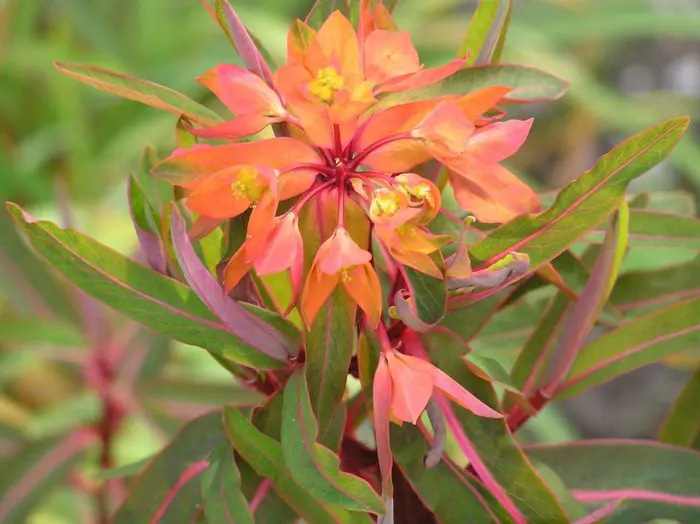 De bloei van de Euphorbia griffithii 'Dixter' is roodoranje aan een oranje toe grijspaarse stengel.