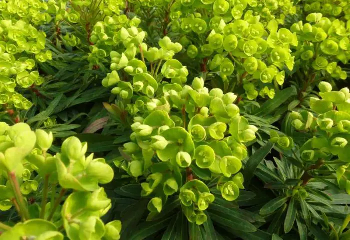 Euphorbia 'Redwing' vormt een ronde plant met aan het einde van de winter, lichtrode jonge scheuten.