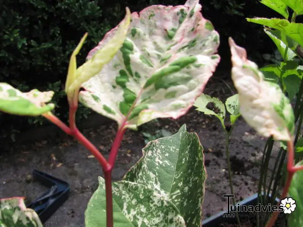 Fallopia japonica 'Variegata' heeft hartvormige, cremewitte bladeren met groene spatten.