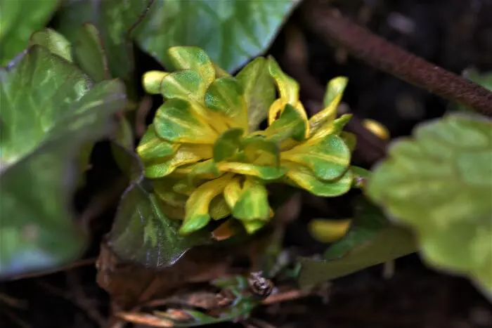 Ficaria verna 'Green Petal' vormt een tapijt van bladrozetten met zilvergrijs gemarmerde, hartvormige blaadjes.