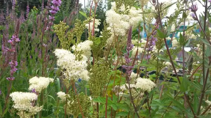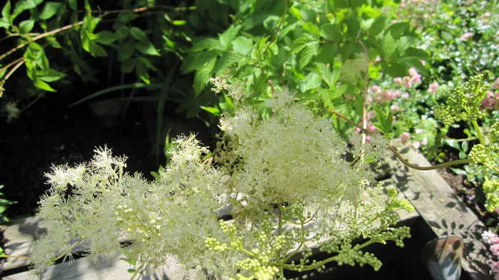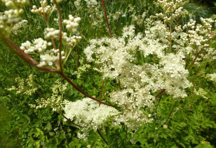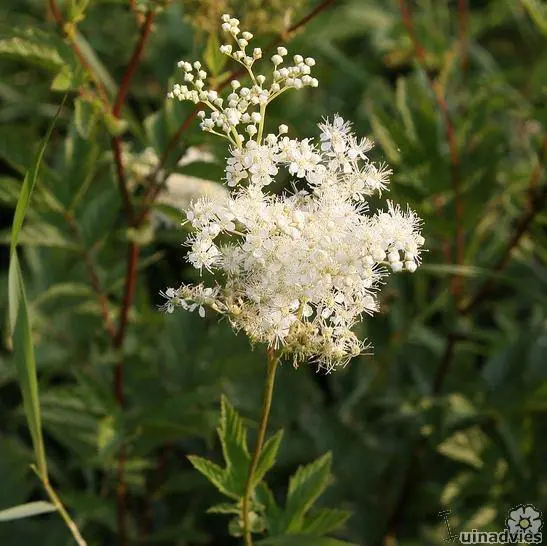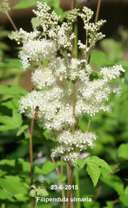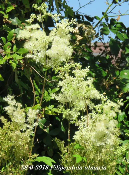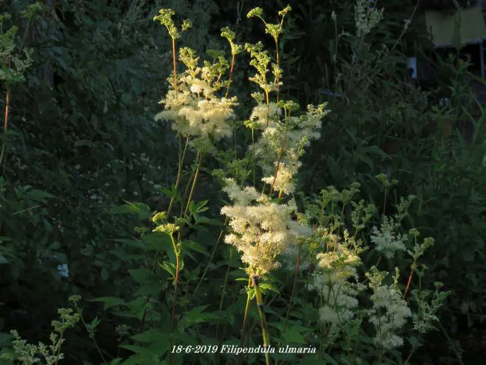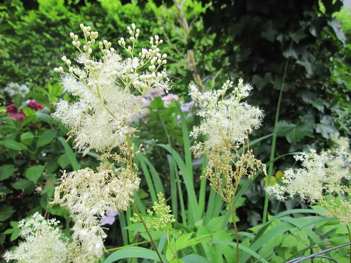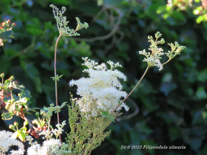 Bloeit met pluizige trossen van kleine roomwitte bloempjes met opvallend lange meeldraden.