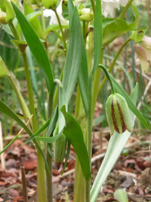 De knikkende klokvormige bloemen zijn smaragdgroen met bruinrood en aan de binnenkant mooi getekend met een licht ruitmotief.Bladeren zijn zeegroen en lancetvormig.Plant in het najaar de bollen op 8/10cm diepte in een goed doorlatende grond.