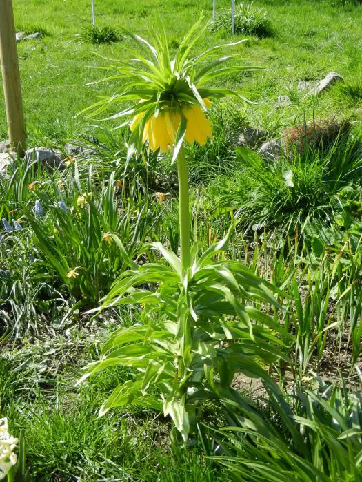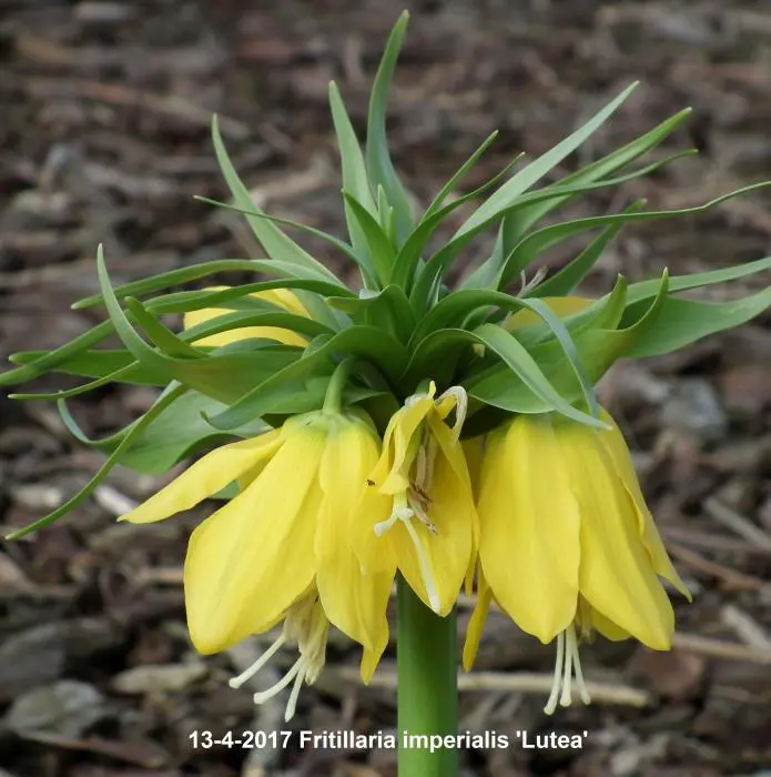 Fritillaria imperialis 'Lutea' bloeit citroengeel.