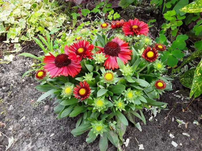Het is een kortlevende vast plant met margrietachtige rode bloem (composiet) en een donkerrood/geel hart.