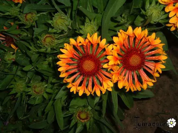Gaillardia x grandiflora 'Burgunder' is een echt buitenbeentje van de Gaillardia, de bloemblaadjes lijken op kleine oranje trompetjes met gele toppen, rond een rood hart.
