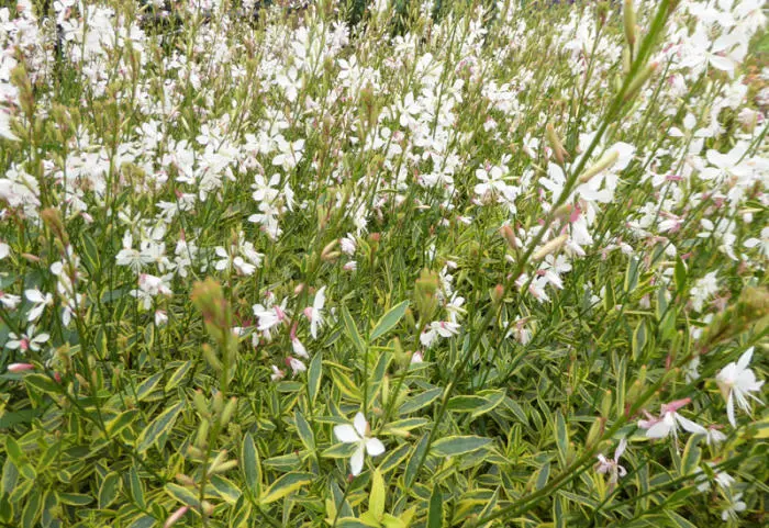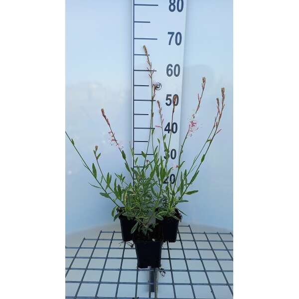 Gaura lindheimeri 'Corrie's Gold' is een kortlevende bossige plant met een lange bloeitijd van lichtroze/witte vlinderachtige bloemen uit roze knoppen. Bloeien op lange fijne stelen, wuivend in de wind.