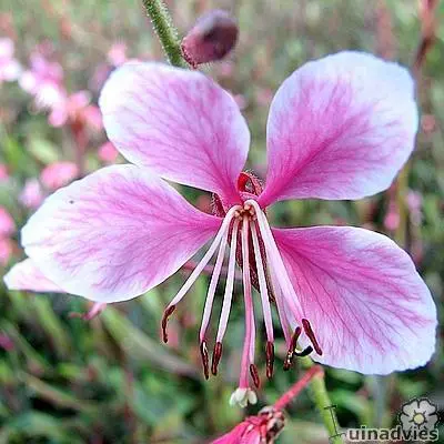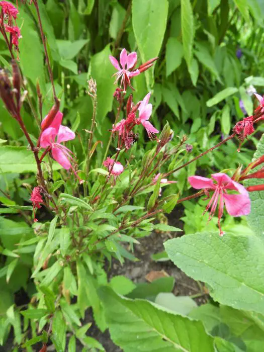 Gaura lindheimeri 'Pink Dwarf' is een kortlevende bossige plant met een lange bloeitijd van dieproze vlinderachtige bloemen uit roze knoppen. Bloeien op lange fijne stelen, wuivend in de wind.