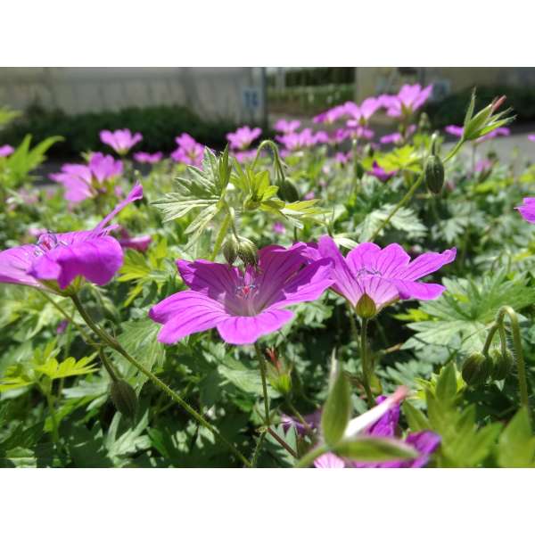 Geranium 'JS Deux Fleurs' bloeit met 2 bloemen per stengel met helderroodroze bloemen.
