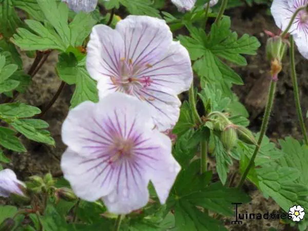 Geranium himalayense 'Derrick Cook' is een heuvelvormende vaste plant met diep gelobde, geaderde bladeren, licht behaard en donkergroen. In het najaar verkleuren ze oranjerood.