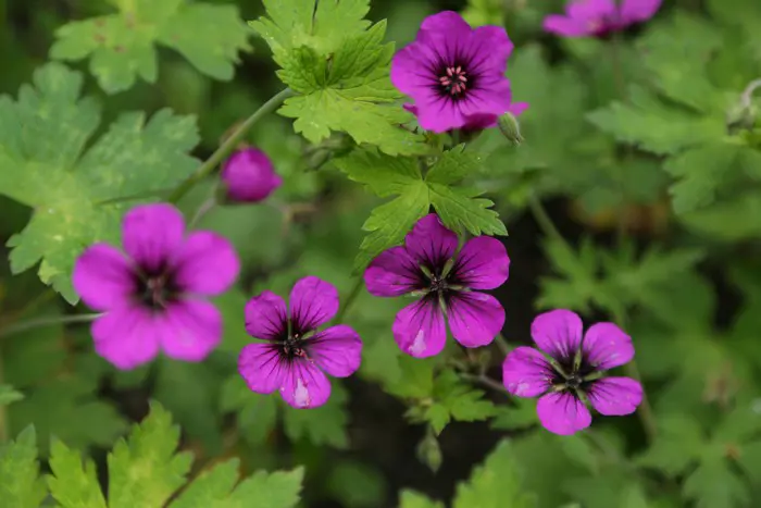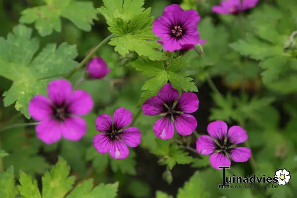 Geranium 'Anne Thomson' is een bodembedekkende plant met een spreidende groeiwijze (60cm) en ronde diep gelobde, getande, geelgroene bladeren.