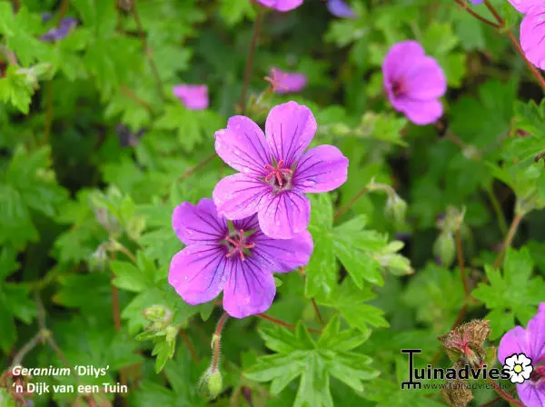Geranium 'Dilys' is een langbloeiende ooievaarsbek waarvan de paarsgestreepte, fuchsiaroze bloemen in de zomer naar bessenrood verkleuren. De bloemen zijn iets donkerder in het centrum.
