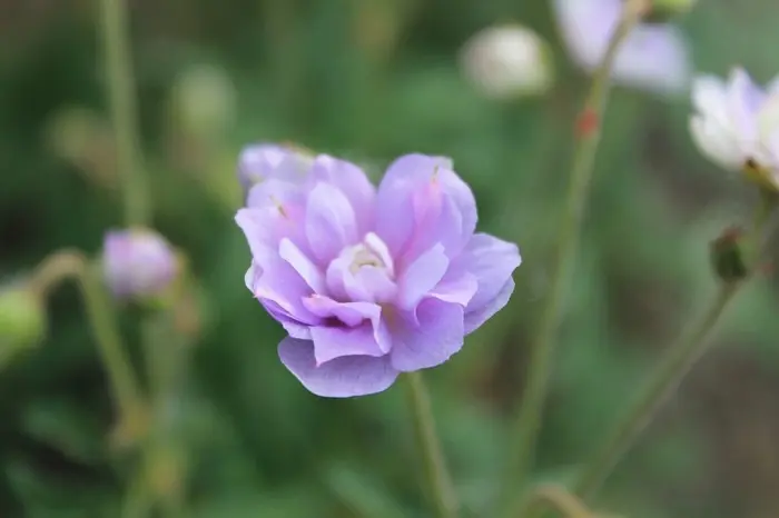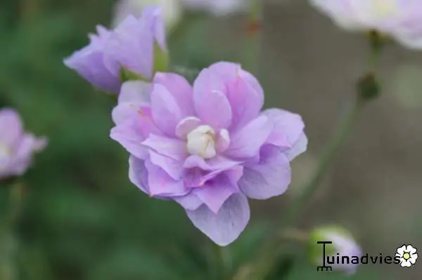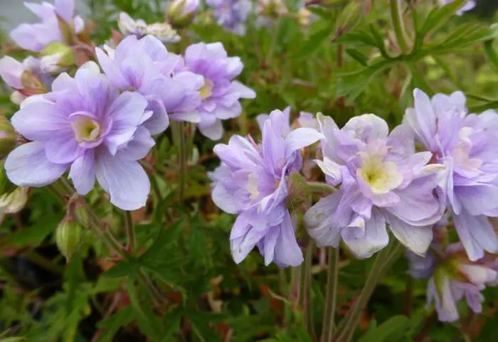 Geranium pratense 'Summer Skies' bloeit met prachtige dubbele lavendelblauwe bloemen geaccentueerd met roze.