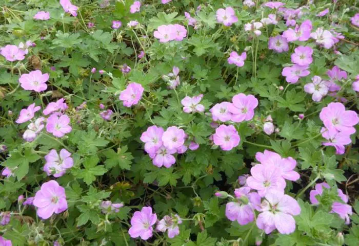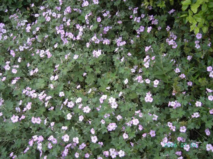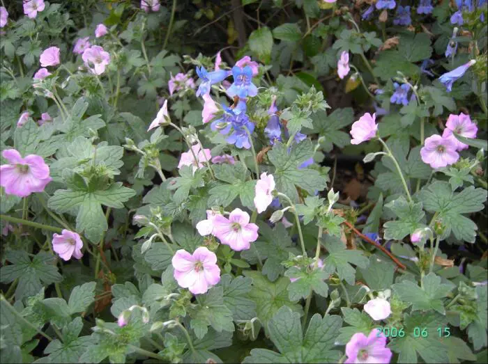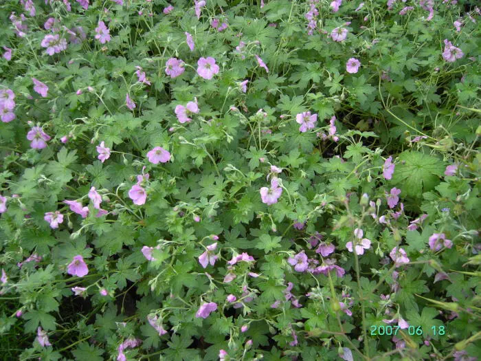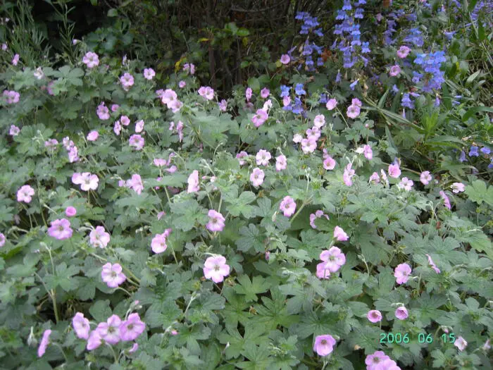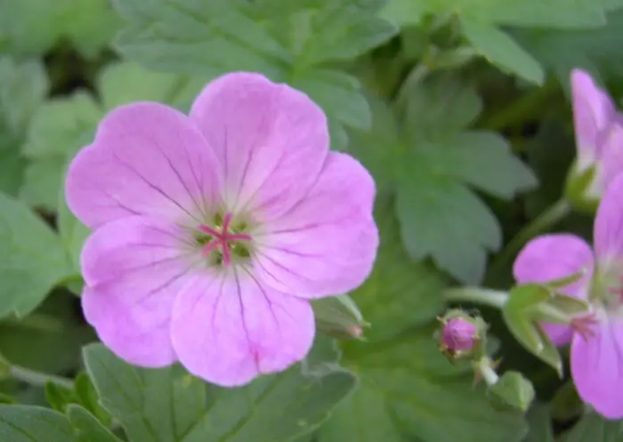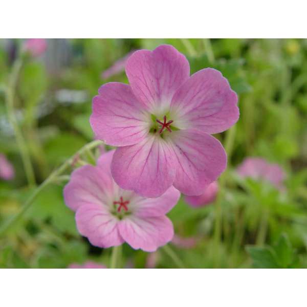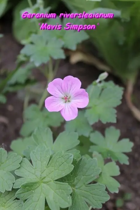 Geranium x riversleaianum 'Mavis Simpson' is een groeikrachtige bodembedekkende plant met donzig grijsgroen, gelobd blad en doorlopend bloeiend van mei tot oktober met lilaroze bloemen.