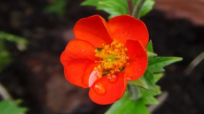 Geum coccineum 'Koi' bloeit met enkelvoudige feloranje bloemen.