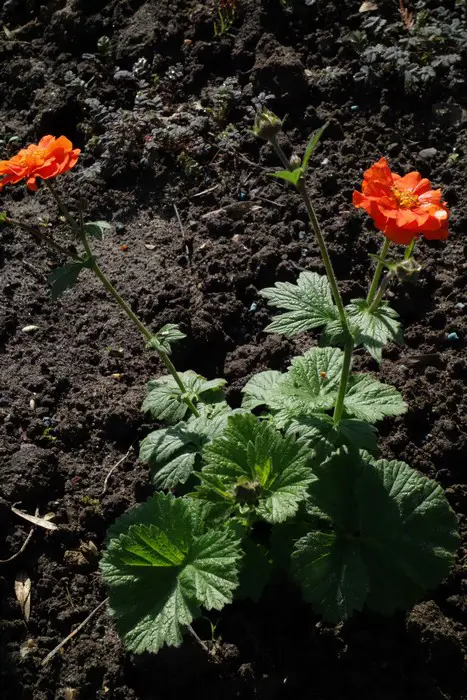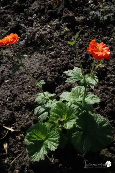 Geum coccineum 'Werner Arends' bloeit met dubbele, intens oranje/ goudoranje bloemen.