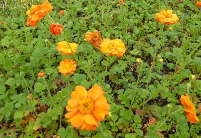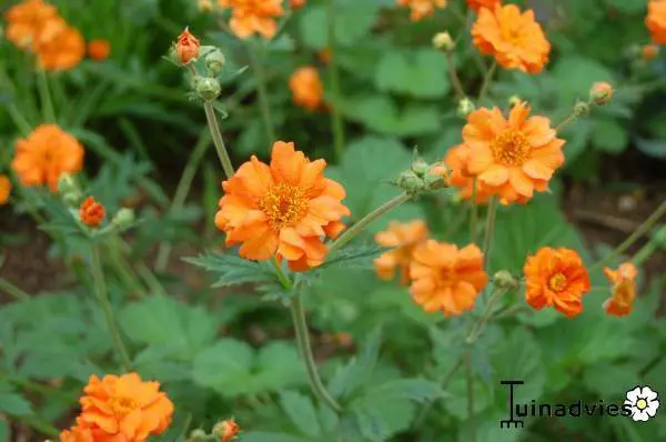 Geum 'Prinses Juliana' bloeit met dubbele, feloranje bloemen.