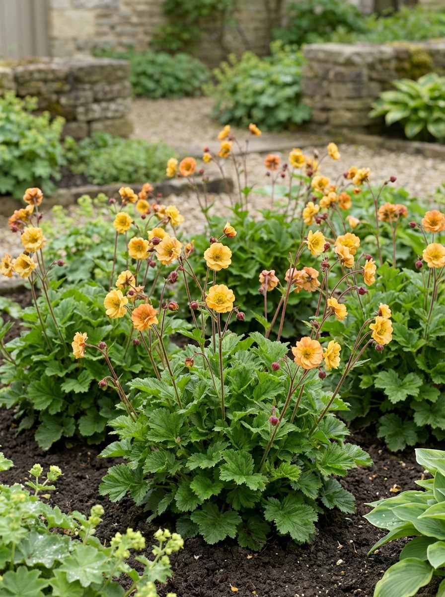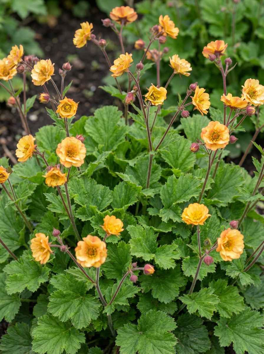 Geum 'Tutti Frutti' is een langbloeiende compacte borderplant met iets knikkende, enkele tot halfdubbele bloemen in warme kleuren van geel, oranje en rood. De groene stengels worden na verloop van tijd donkerder.