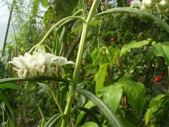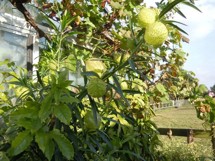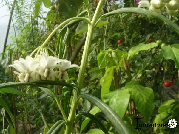 Gomphocarpus physocarpus bloeit met witte bloempjes die later tot groene/ bruingroene, behaarde blaasvruchten groeien waaruit dan de zijdeachtige zaadpluizen uitkomen.