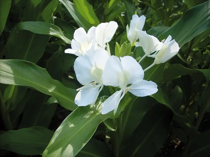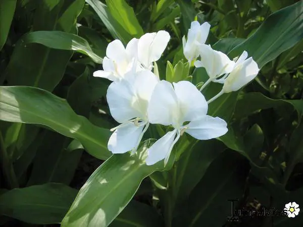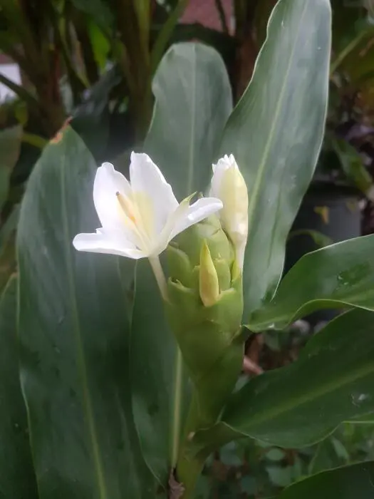 Bloeit met heerlijk geurende witte vlinderachtige bloemen, een beetje zoals een gladiool, steeds één bloempje, daarna weer één bloempje. De bladeren zijn niet zo aantrekkelijk, enorme bladeren die doen denken aan maïsbladeren, maar de bloem en haar overweldigende geur maakt dit ruimschoots goed.
