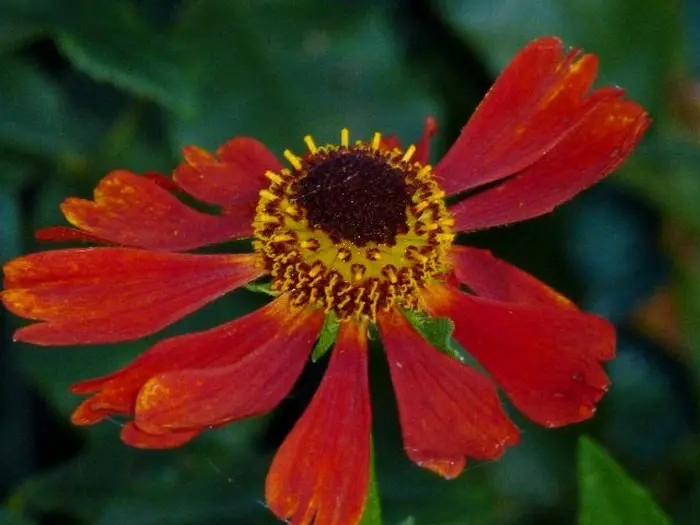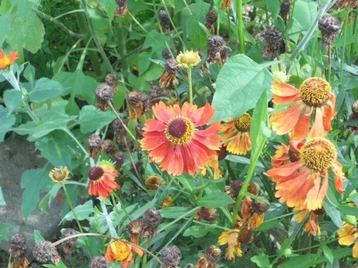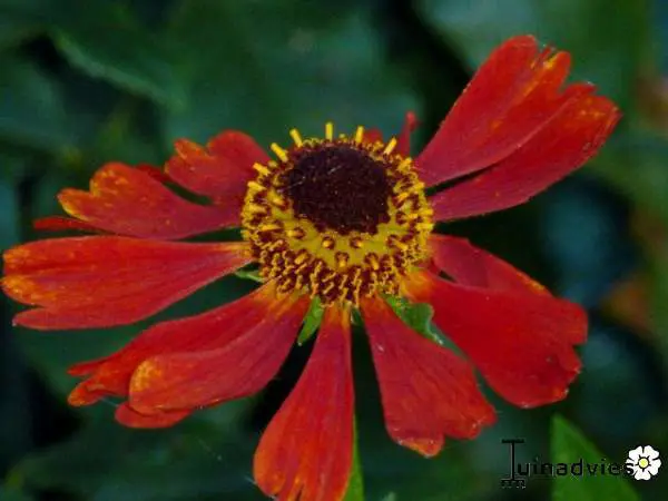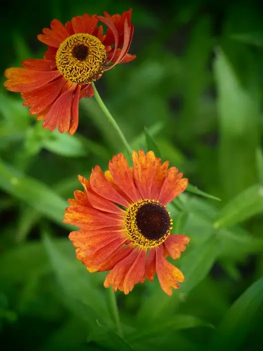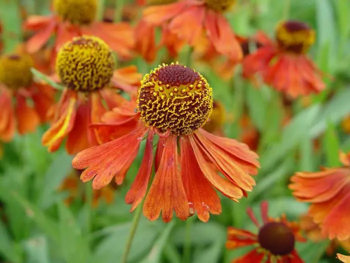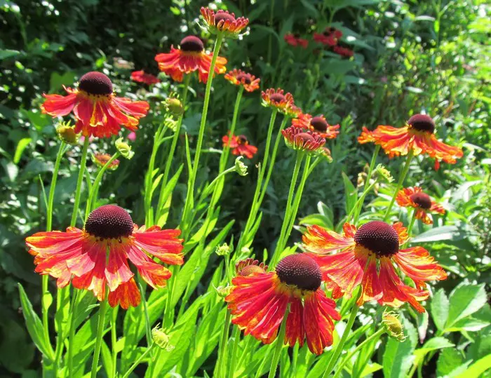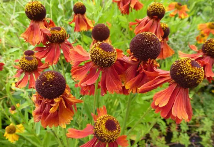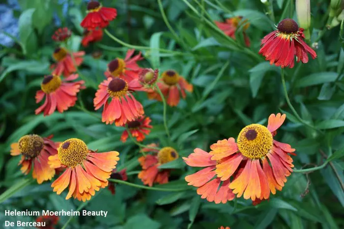 Helenium 'Moerheim Beauty' bloeit rijkelijk met grote bloemen van een flamboyante koperachtig roodoranje kleur rond een opvallende chocoladebruine kegel met goudgele meeldraden.