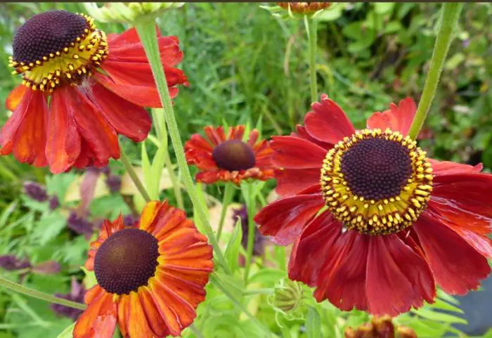 Helenium 'Red Army' bloeit met grote kardinaalrood. In het centrum een opvallende bruine kegel met goudgele meeldraden.