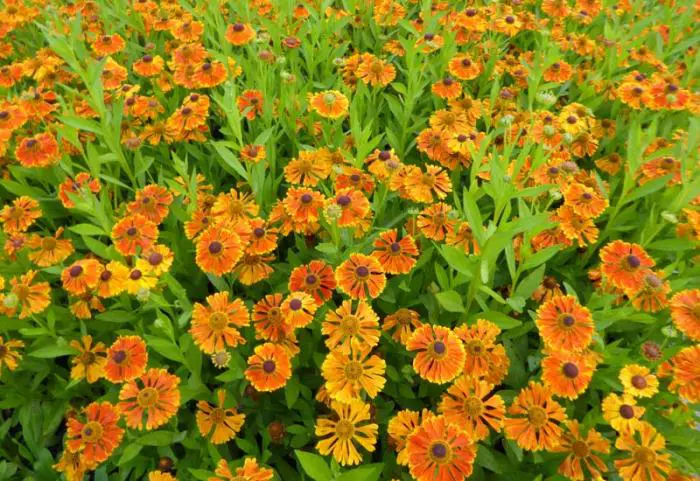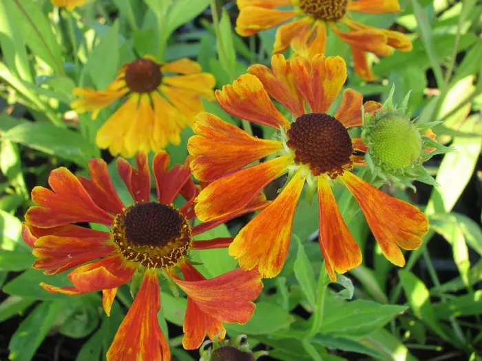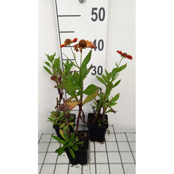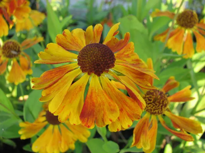Helenium hybr. 'Waltraut' bloeit met grote bloemen van een flamboyante fel oranje kleur die geleidelijk vervaagt aan de randen van de bloembladen om een geeloranje kleur aan te nemen.