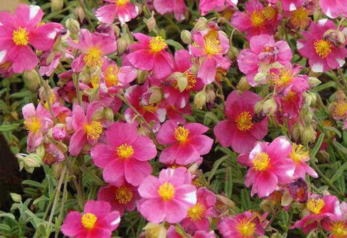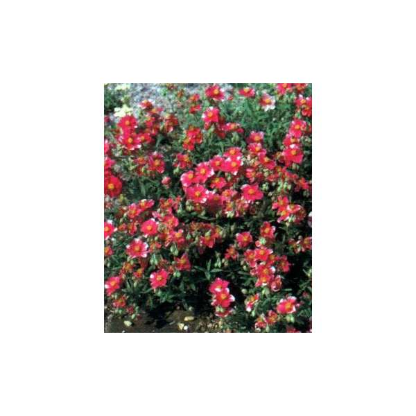 Helianthemum 'Raspberry Ripple' is een halfheestertje waarvan de rode bloemblaadjes witte vlekjes vertonen.