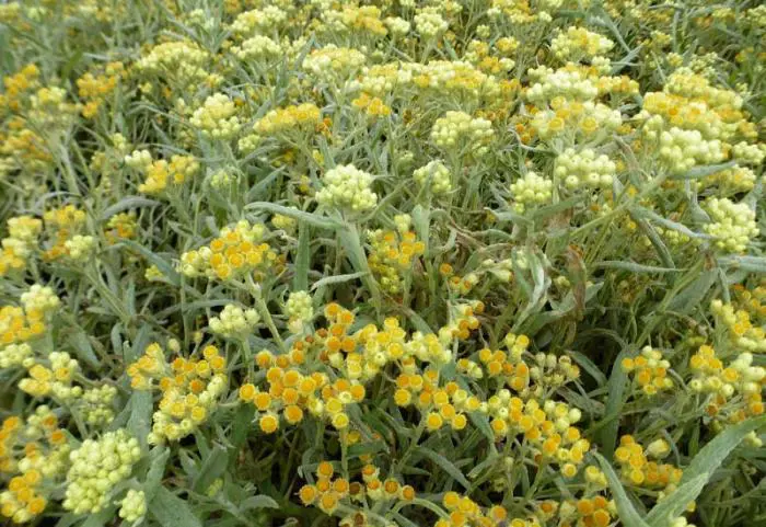 Helichrysum 'Schwefellicht' bloeit met trosjes van zwavelgele bloemhoofdjes.