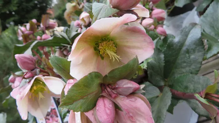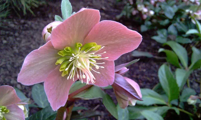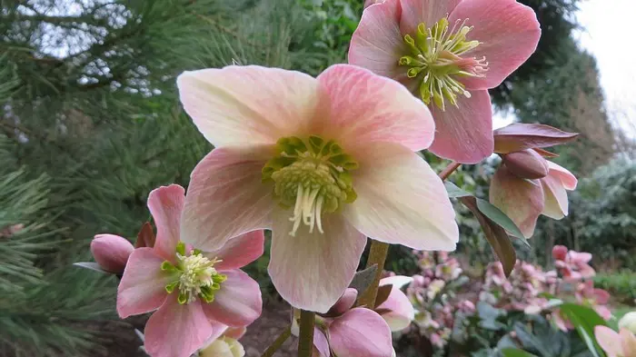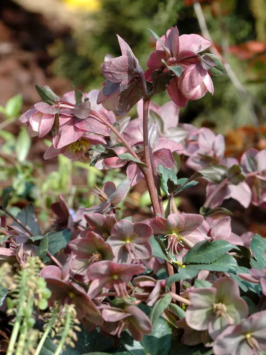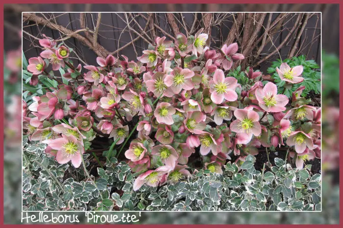 Helleborus x ericsmithii 'Pirouette' is een rijkbloeiende nieskruid met roze/witte bloemen.